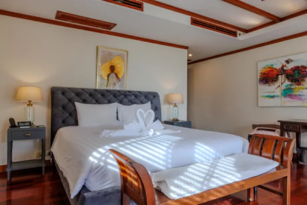 • A three-bedroom villa on a hill near Patong with beautiful views of the Andaman Sea. Its elevated location provides a quiet and peaceful setting, despite its proximity to resort life.The villa is bright and spacious, featuring a living room, a fully equipped kitchen, and three double bedrooms with en-suite bathrooms. It features a large garden plot, a private pool with a terrace, a relaxation pavilion, and areas with panoramic sea views.