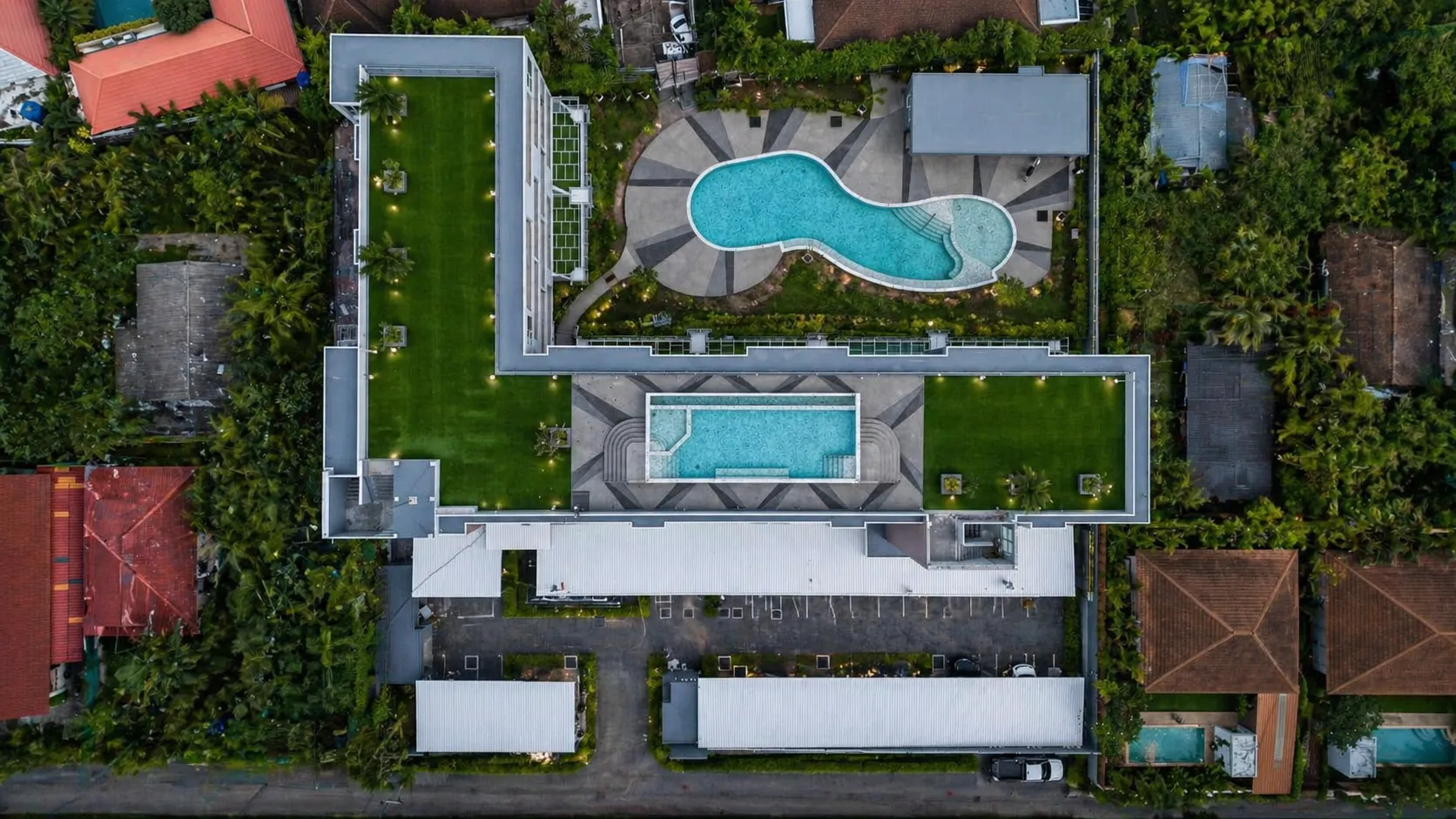 На территории комплекса расположены 2 бассейна с джакузи, детский бассейн, лобби и зона рецепции, бар, сад на крыше, парковка и прачечная, все это с круглосуточным видеонаблюдением и охраной.